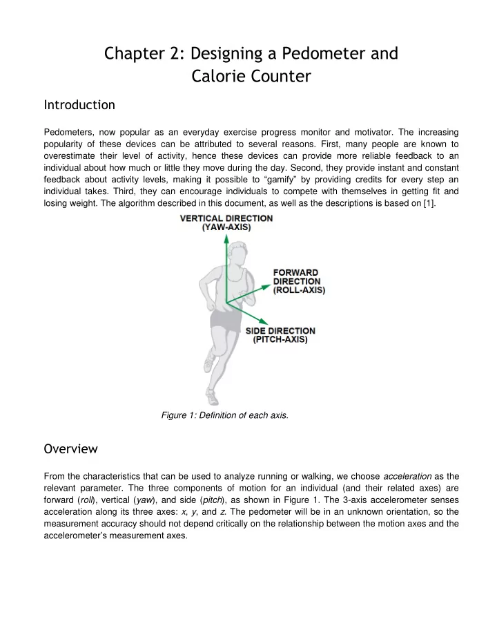 Chapter 2: Designing a Pedometer and Calorie Counter Introduction Pedometers, now popular as an everyday exercise progress monitor and motivator. The increasing popularity of these devices can be attributed to several reasons. First, many people are known to overestimate their level of activity, hence these devices can provide more reliable feedback to an individual about how much or little they move during the day. Second, they provide instant and constant feedback about activity levels, making it possible to “gamify” by providing credits for every step an individual takes. Third, they can encourage individuals to compete with themselves in getting fit and losing weight. The algorithm described in this document, as well as the descriptions is based on [1]. Figure 1: Definition of each axis. Overview From the characteristics that can be used to analyze running or walking, we choose acceleration as the relevant parameter. The three components of motion for an individual (and their related axes) are forward ( roll ), vertical ( yaw ), and side ( pitch ), as shown in Figure 1. The 3-axis accelerometer senses acceleration along its three axes: x , y , and z . The pedometer will be in an unknown orientation, so the measurement accuracy should not depend critically on the relationship between the motion axes and the accelerometer ’s measurement axes.