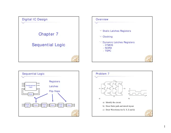 Digital IC Design Overview Static Latches Registers Static Latches Registers Chapter 7 Clocking Dynamic Latches Registers Sequential Logic q g - C 2 MOS - NORA - TSPC Sequential Logic Problem 7 Registers V DD Y Z B Combinational Latches Latches Logic X A B B Q Flip-flops A B B State t a) b) a) Identify the circuit. Comb. Comb. Comb. State State State Logic Logic Logic b) Draw Euler path and sketch layout c) Draw Waveforms for X, Y, Z and Q 1