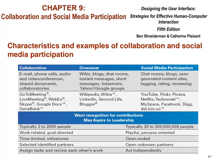 Designing the User Interface: Strategies for Effective Human-Computer Interaction Fifth Edition Ben Shneiderman & Catherine Plaisant Characteristics and examples of collaboration and social media participation 9-*