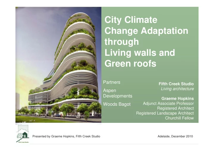City Climate Change Adaptation through Living walls and Green roofs Partners Fifth Creek Studio Living architecture Aspen Developments Graeme Hopkins Adjunct Associate Professor Woods Bagot Registered Architect Registered Landscape Architect Churchill Fellow Singapore taking green infrastructure tonew heights One Bishops Square Delivered by CIRIA and Livingroofs.org Allen & Overy Presented by Graeme Hopkins, Fifth Creek Studio Adelaide, December 2010 15 16 September