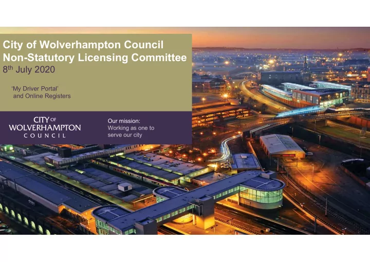 City of Wolverhampton Council Non-Statutory Licensing Committee 8 th July 2020 ‘My Driver Portal’ and Online Registers Our mission: Working as one to serve our city