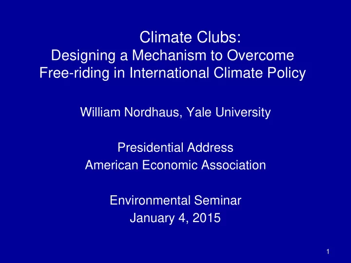 Climate Clubs: Designing a Mechanism to Overcome Free-riding in International Climate Policy William Nordhaus, Yale University Presidential Address American Economic Association Environmental Seminar January 4, 2015 1