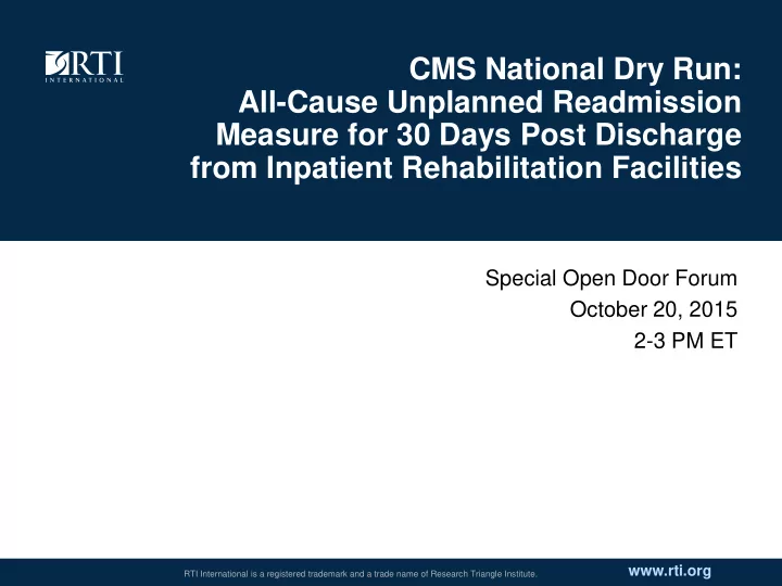 CMS National Dry Run: All-Cause Unplanned Readmission Measure for 30 Days Post Discharge from Inpatient Rehabilitation Facilities Special Open Door Forum October 20, 2015 2-3 PM ET www.rti.org RTI International is a registered trademark and a trade name of Research Triangle Institute.