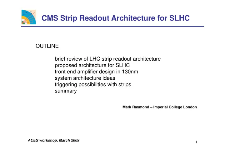 CMS Strip Readout Architecture for SLHC OUTLINE brief review of LHC strip readout architecture p proposed architecture for SLHC front end amplifier design in 130nm system architecture ideas system architecture ideas triggering possibilities with strips summary Mark Raymond – Imperial College London ACES workshop, March 2009 1