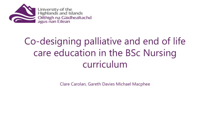 Co-designing palliative and end of life care education in the BSc Nursing curriculum Clare Carolan, Gareth Davies Michael Macphee