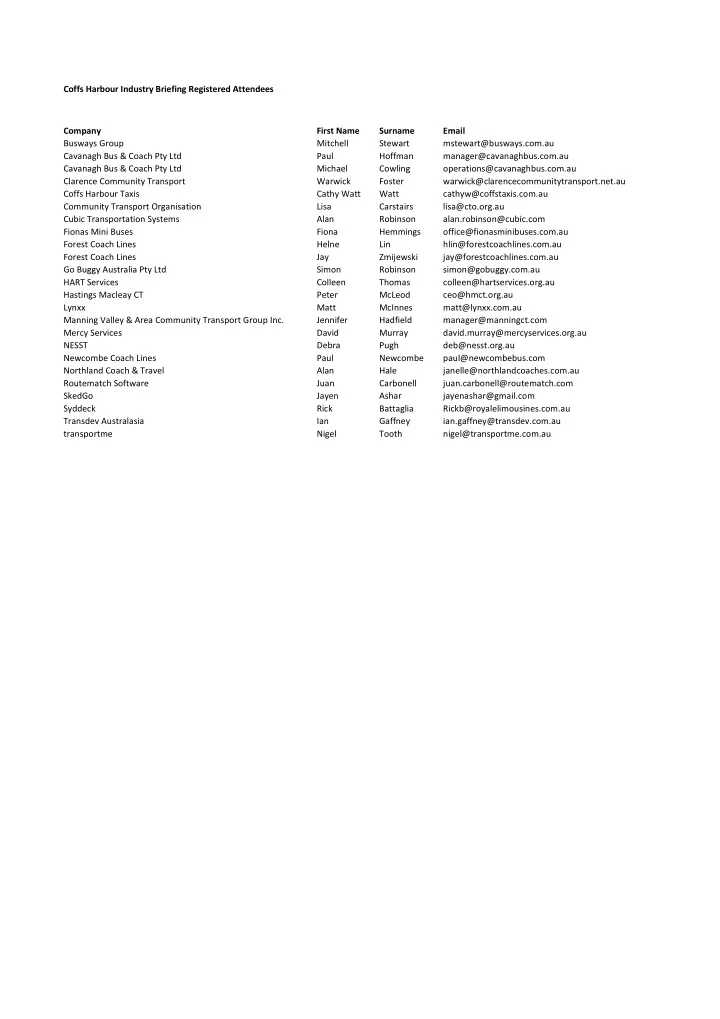 Coffs Harbour Industry Briefing Registered Attendees Company First Name Surname Email Busways Group Mitchell Stewart mstewart@busways.com.au Cavanagh Bus & Coach Pty Ltd Paul Hoffman manager@cavanaghbus.com.au Cavanagh Bus & Coach Pty Ltd Michael Cowling operations@cavanaghbus.com.au Clarence Community Transport Warwick Foster warwick@clarencecommunitytransport.net.au Coffs Harbour Taxis Cathy Watt Watt cathyw@coffstaxis.com.au Community Transport Organisation Lisa Carstairs lisa@cto.org.au Cubic Transportation Systems Alan Robinson alan.robinson@cubic.com Fionas Mini Buses Fiona Hemmings office@fionasminibuses.com.au Forest Coach Lines Helne Lin hlin@forestcoachlines.com.au Forest Coach Lines Jay Zmijewski jay@forestcoachlines.com.au Go Buggy Australia Pty Ltd Simon Robinson simon@gobuggy.com.au HART Services Colleen Thomas colleen@hartservices.org.au Hastings Macleay CT Peter McLeod ceo@hmct.org.au Lynxx Matt McInnes matt@lynxx.com.au Manning Valley & Area Community Transport Group Inc. Jennifer Hadfield manager@manningct.com Mercy Services David Murray david.murray@mercyservices.org.au NESST Debra Pugh deb@nesst.org.au Newcombe Coach Lines Paul Newcombe paul@newcombebus.com Northland Coach & Travel Alan Hale janelle@northlandcoaches.com.au Routematch Software Juan Carbonell juan.carbonell@routematch.com SkedGo Jayen Ashar jayenashar@gmail.com Syddeck Rick Battaglia Rickb@royalelimousines.com.au Transdev Australasia Ian Gaffney ian.gaffney@transdev.com.au transportme Nigel Tooth nigel@transportme.com.au