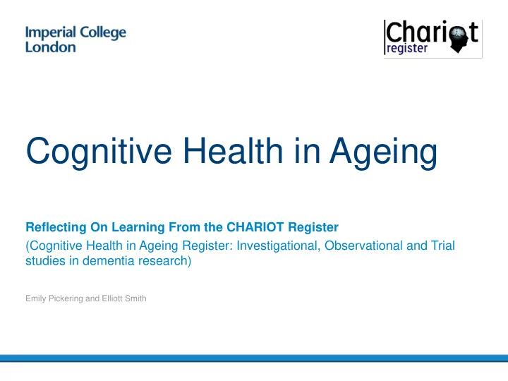 Cognitive Health in Ageing Reflecting On Learning From the CHARIOT Register (Cognitive Health in Ageing Register: Investigational, Observational and Trial studies in dementia research) Emily Pickering and Elliott Smith
