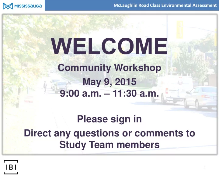 McLaughlin Road Class Environmental Assessment Community Workshop May 9, 2015 9:00 a.m. – 11:30 a.m. Please sign in Direct any questions or comments to Study Team members 1