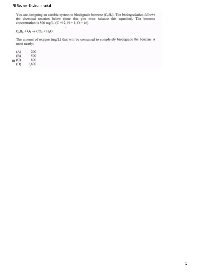 FE Review-Environmental You are designing an aerobic system to biodegrade benzene (C,H t ,). The biodegradation follows the chemical reaction below (note that you must balance this equation). Hie benzene concentration is 500 mg/L. (C =12. H = 1,0 = 16) CtHi + £>>• COt + H ; 0 The amount of oxygen (mg/L) that wli will be consumed to completely biodegrade the benzene is most nearly: (A) 200 (8) 500 (C) 800 (D) 1,600 1