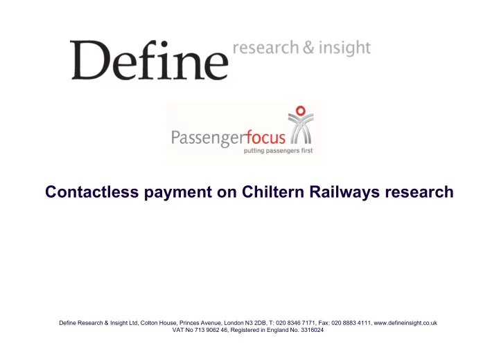 Contactless payment on Chiltern Railways research Define Research & Insight Ltd, Colton House, Princes Avenue, London N3 2DB, T: 020 8346 7171, Fax: 020 8883 4111, www.defineinsight.co.uk VAT No 713 9062 46, Registered in England No. 3316024