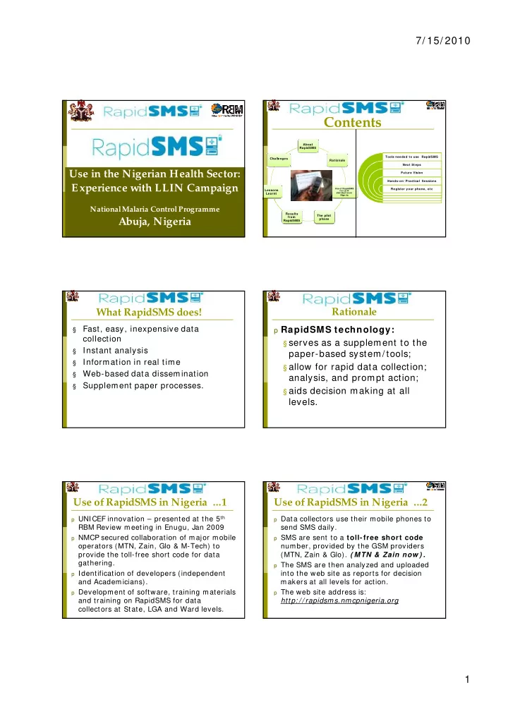 7/ 15/ 2010 Contents About RapidSMS Tools needed to use RapidSMS Challenges Rationale Next Steps Use in the Nigerian Health Sector: Future Vision Hands-on/ Practica l Sessions Experience with LLIN Campaign Use of RapidSMS Register your phone, etc Lessons f or LLI N dist ribut ion in Learnt Nigeria National Malaria Control Programme Results The pilot from Abuja, Nigeria phase RapidSMS What RapidSMS does! Rationale Fast, easy, inexpensive data p RapidSMS technology: § collection § serves as a supplement to the Instant analysis § paper-based system/ tools; Information in real time § § allow for rapid data collection; Web-based data dissemination § analysis, and prompt action; Supplement paper processes. § § aids decision making at all levels. Use of RapidSMS in Nigeria ...1 Use of RapidSMS in Nigeria ...2 p UNI CEF innovation – presented at the 5 th p Data collectors use their mobile phones to RBM Review meeting in Enugu, Jan 2009 send SMS daily. p NMCP secured collaboration of major mobile p SMS are sent to a toll- free short code operators (MTN, Zain, Glo & M-Tech) to number, provided by the GSM providers provide the toll-free short code for data (MTN, Zain & Glo). ( MTN & Zain now ) . gathering. p The SMS are then analyzed and uploaded p Identification of developers (independent into the web site as reports for decision and Academicians). makers at all levels for action. p Development of software, training materials p The web site address is: and training on RapidSMS for data http: / / rapidsms.nmcpnigeria.org collectors at State, LGA and Ward levels. 1