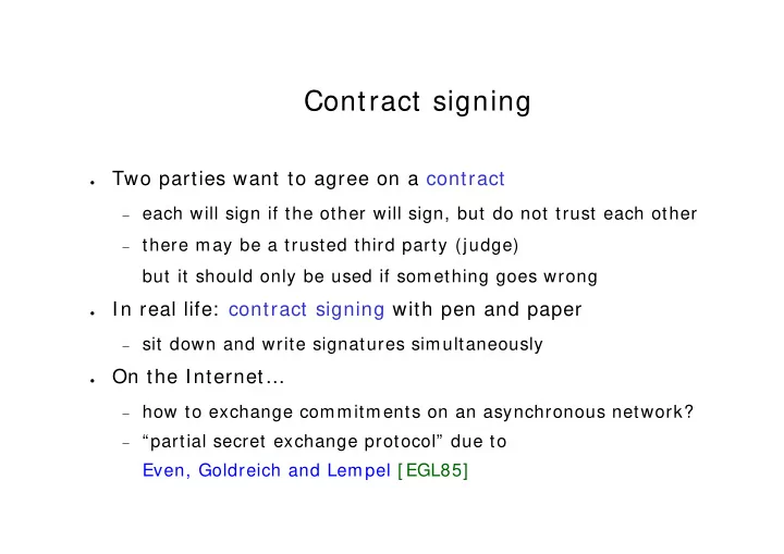 Contract signing Two parties want to agree on a contract ● − each will sign if the other will sign, but do not trust each other − there may be a trusted third party (judge) but it should only be used if something goes wrong In real life: contract signing with pen and paper ● − sit down and write signatures simultaneously On the Internet… ● − how to exchange commitments on an asynchronous network? − “partial secret exchange protocol” due to Even, Goldreich and Lempel [ EGL85]