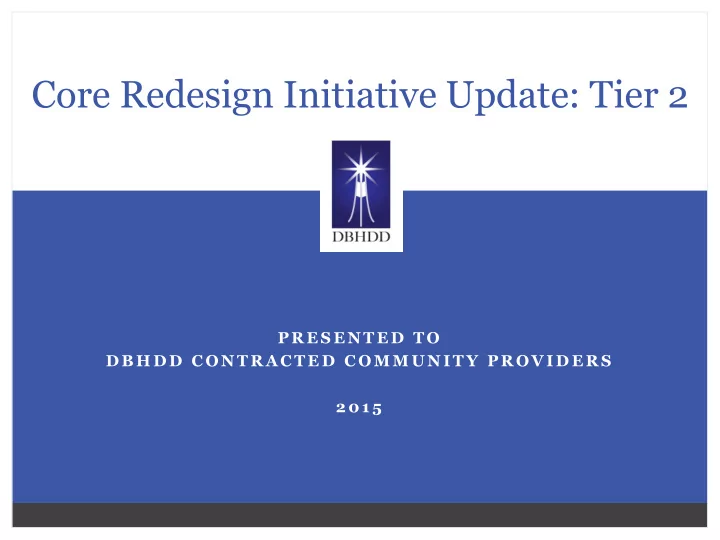 Core Redesign Initiative Update: Tier 2 P R E S E N T E D T O D B H D D C O N T R A C T E D C O M M U N I T Y P R O V I D E R S 2 0 1 5