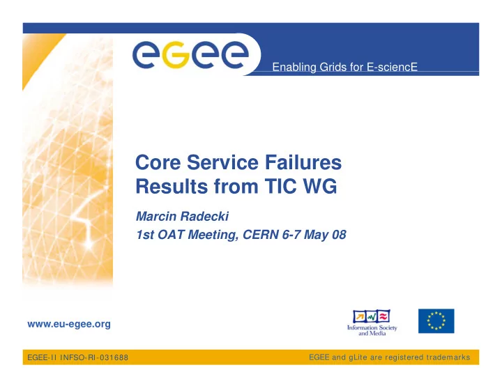 Enabling Grids for E-sciencE g Core Service Failures Co e Se ce a u es Results from TIC WG Marcin Radecki Marcin Radecki 1st OAT Meeting, CERN 6-7 May 08 www.eu-egee.org EGEE-II INFSO-RI-031688 EGEE and gLite are registered trademarks