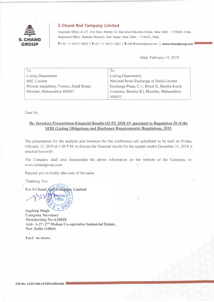 S Chand And Company Limited -!. Corporate Office: A-27, 2nd Floor, Mohan Co-Operative Industrial Estate, New Delhi - 110044, India. � T Registered Office: Ravindra Mansion, Ram Nagar, New Delhi - 110055, India. S.CHAND P:'+91 11 4973 1800 I F:+91 11 4973 1801 I E: info@schandgroup.com I wwx.schandgroup.com GROUP Date: February 14, 2019 To To Listing Depa,tment Listing Department, BSE Limited National Stock Exchange of India Limited Phiroze Jeejeebhoy Towers, Dalal Street, Exchange Plaza, C-1, Block G, Sandra Kurla Mumbai, Maharashtra 400001 Complex, Sandra (E), Mumbai, Maharashtra 400051 Dear Sir, Re: Investors Presentation-Financial Results-O3 FY 2018-19 -pursuant to Regulation 30 of the SEBI (Listing Obligations and Disclosure Requirements) Regulations, 2015 The presentation for the analysts and investors fpr the conffrence call scheduled to be held on Friday, February 15, 2019 at I: 00 P .M. to discuss the financial results for the quarte� ended December J I, 2018 is attached herewith. ' I The Company shall also disseminate the above infprmation on the website of the Company 1.e. / www.schandgroup.com. Request you to kindly take note of the same. Thanking You. I Encl: As above CIN No. L22219Dl 1970PLC005400