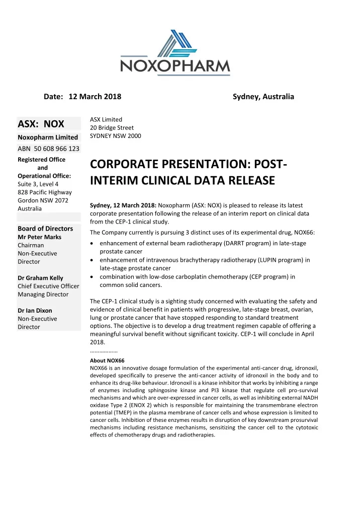 Date: 12 March 2018 Sydney, Australia ASX Limited ASX: NOX 20 Bridge Street SYDNEY NSW 2000 Noxopharm Limited ABN 50 608 966 123 Registered Office CORPORATE PRESENTATION: POST- and Operational Office: INTERIM CLINICAL DATA RELEASE Suite 3, Level 4 828 Pacific Highway Gordon NSW 2072 Sydney, 12 March 2018: Noxopharm (ASX: NOX) is pleased to release its latest Australia corporate presentation following the release of an interim report on clinical data from the CEP-1 clinical study. Board of Directors The Company currently is pursuing 3 distinct uses of its experimental drug, NOX66: Mr Peter Marks enhancement of external beam radiotherapy (DARRT program) in late-stage Chairman prostate cancer Non-Executive enhancement of intravenous brachytherapy radiotherapy (LUPIN program) in Director late-stage prostate cancer combination with low-dose carboplatin chemotherapy (CEP program) in Dr Graham Kelly common solid cancers. Chief Executive Officer Managing Director The CEP-1 clinical study is a sighting study concerned with evaluating the safety and evidence of clinical benefit in patients with progressive, late-stage breast, ovarian, Dr Ian Dixon lung or prostate cancer that have stopped responding to standard treatment Non-Executive options. The objective is to develop a drug treatment regimen capable of offering a Director meaningful survival benefit without significant toxicity. CEP-1 will conclude in April 2018. ……………… About NOX66 NOX66 is an innovative dosage formulation of the experimental anti-cancer drug, idronoxil, developed specifically to preserve the anti-cancer activity of idronoxil in the body and to enhance its drug-like behaviour. Idronoxil is a kinase inhibitor that works by inhibiting a range of enzymes including sphingosine kinase and PI3 kinase that regulate cell pro-survival mechanisms and which are over-expressed in cancer cells, as well as inhibiting external NADH oxidase Type 2 (ENOX 2) which is responsible for maintaining the transmembrane electron potential (TMEP) in the plasma membrane of cancer cells and whose expression is limited to cancer cells. Inhibition of these enzymes results in disruption of key downstream prosurvival mechanisms including resistance mechanisms, sensitizing the cancer cell to the cytotoxic effects of chemotherapy drugs and radiotherapies.