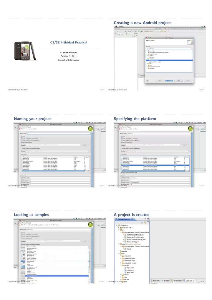 Getting started Running an application Managing apps Debugging apps Designing layouts with XML Getting started Running an application Managing apps Debugging apps Designing layouts with XML Creating a new Android project CS/SE Individual Practical Stephen Gilmore October 7, 2011 School of Informatics CS/SE Individual Practical 1 / 44 CS/SE Individual Practical 2 / 44 Getting started Running an application Managing apps Debugging apps Designing layouts with XML Getting started Running an application Managing apps Debugging apps Designing layouts with XML Naming your project Specifying the platform CS/SE Individual Practical 3 / 44 CS/SE Individual Practical 4 / 44 Getting started Running an application Managing apps Debugging apps Designing layouts with XML Getting started Running an application Managing apps Debugging apps Designing layouts with XML Looking at samples A project is created CS/SE Individual Practical 5 / 44 CS/SE Individual Practical 6 / 44