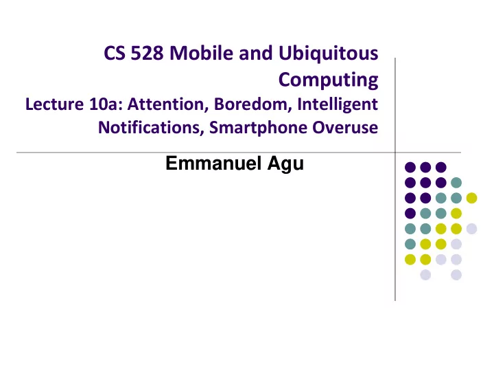 CS 528 Mobile and Ubiquitous Computing Lecture 10a: Attention, Boredom, Intelligent Notifications, Smartphone Overuse Emmanuel Agu
