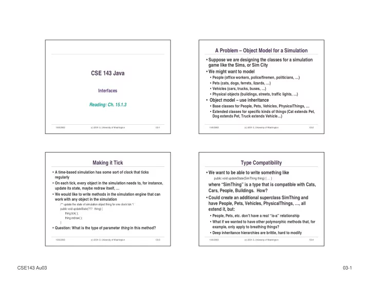 A Problem – Object Model for a Simulation • Suppose we are designing the classes for a simulation game like the Sims, or Sim City • We might want to model CSE 143 Java • People (office workers, police/firemen, politicians, …) • Pets (cats, dogs, ferrets, lizards, …) • Vehicles (cars, trucks, buses, …) Interfaces • Physical objects (buildings, streets, traffic lights, …) • Object model – use inheritance Reading: Ch. 15.1.3 • Base classes for People, Pets, Vehicles, PhysicalThings, … • Extended classes for specific kinds of things (Cat extends Pet, Dog extends Pet, Truck extends Vehicle…) 10/9/2003 (c) 2001-3, University of Washington 03-1 10/9/2003 (c) 2001-3, University of Washington 03-2 Making it Tick Type Compatibility • A time-based simulation has some sort of clock that ticks • We want to be able to write something like regularly public void updateState(SimThing thing) { … } • On each tick, every object in the simulation needs to, for instance, where “SimThing” is a type that is compatible with Cats, update its state, maybe redraw itself, … Cars, People, Buildings. How? • We would like to write methods in the simulation engine that can • Could create an additional superclass SimThing and work with any object in the simulation have People, Pets, Vehicles, PhysicalThings, …, all /** update the state of simulation object thing for one clock tick */ extend it, but: public void updateState(??? thing) { thing.tick( ); • People, Pets, etc. don’t have a real “is-a” relationship thing.redraw( ); • What if we wanted to have other polymorphic methods that, for } example, only apply to breathing things? • Question: What is the type of parameter thing in this method? • Deep inheritance hierarchies are brittle, hard to modify 10/9/2003 (c) 2001-3, University of Washington 03-3 10/9/2003 (c) 2001-3, University of Washington 03-4 CSE143 Au03 03-1