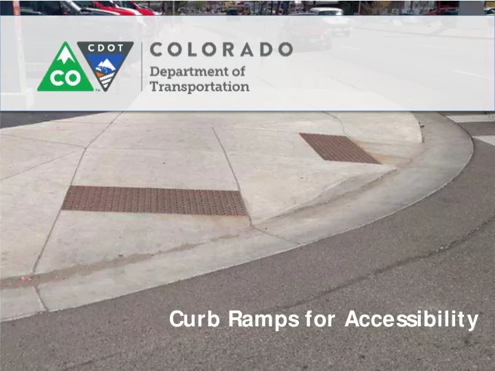 Statewide Curb Ramp Accessibility Program • Federal requirement - ADA • Designing and inspecting to PROWAG standards • CDOT taking aggressive statewide approach to becoming functionally accessible • Prioritizing – ramps that are required but do not exist and those with running slope >12.5%