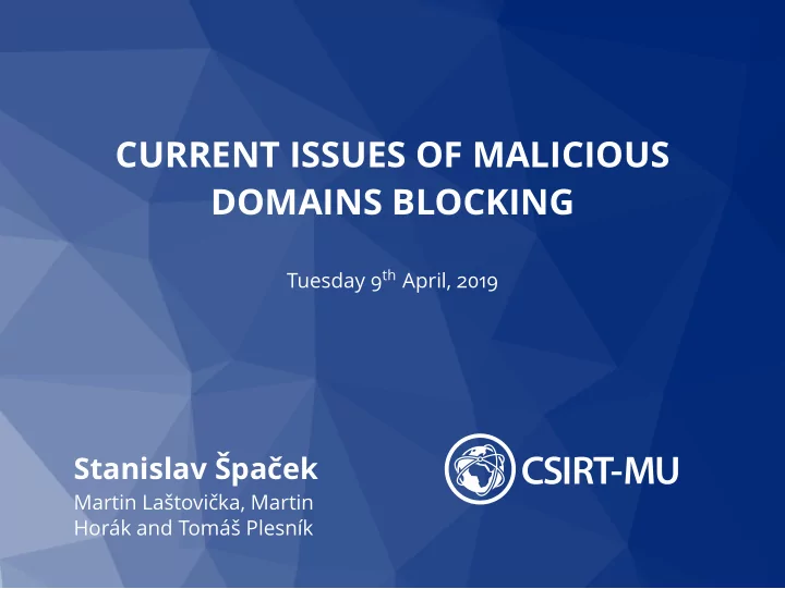 CURRENT ISSUES OF MALICIOUS DOMAINS BLOCKING Tuesday 9 th April, 2019 Stanislav Špaček Martin Laštovička, Martin Horák and Tomáš Plesník