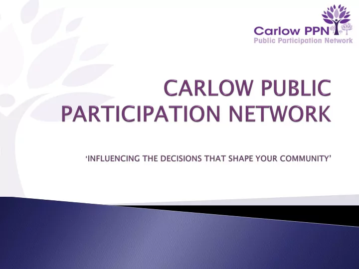 Representative training x 2 in January Rep and Linkage Group Meeting – 1 st May Training Programme Monthly E-Bulletin Website is being updated – www.carlowppn.ie Social media platforms – Facebook and Twitter @CarlowPPN