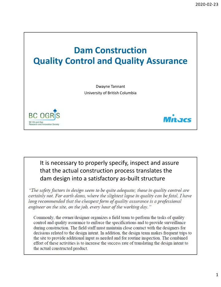 2020 ‐ 02 ‐ 23 Dam Construction Quality Control and Quality Assurance Dwayne Tannant University of British Columbia It is necessary to properly specify, inspect and assure that the actual construction process translates the dam design into a satisfactory as ‐ built structure 2 1