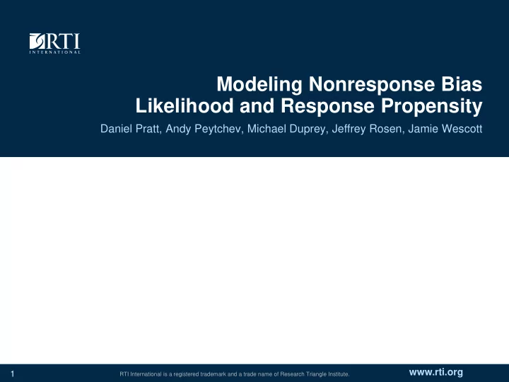 Modeling Nonresponse Bias Likelihood and Response Propensity Daniel Pratt, Andy Peytchev, Michael Duprey, Jeffrey Rosen, Jamie Wescott www.rti.org 1 RTI International is a registered trademark and a trade name of Research Triangle Institute.