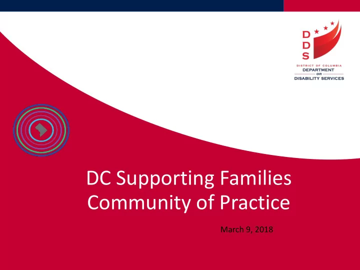 DC Supporting Families Community of Practice Who we are: Family members, advocates with disabilities, government leaders, disability advocacy and services professionals, and other interested community members What we do: Learn, think, and advocate together to create policies, practices and systems that support families that include a member with an intellectual or developmental disability across the life course. 4
