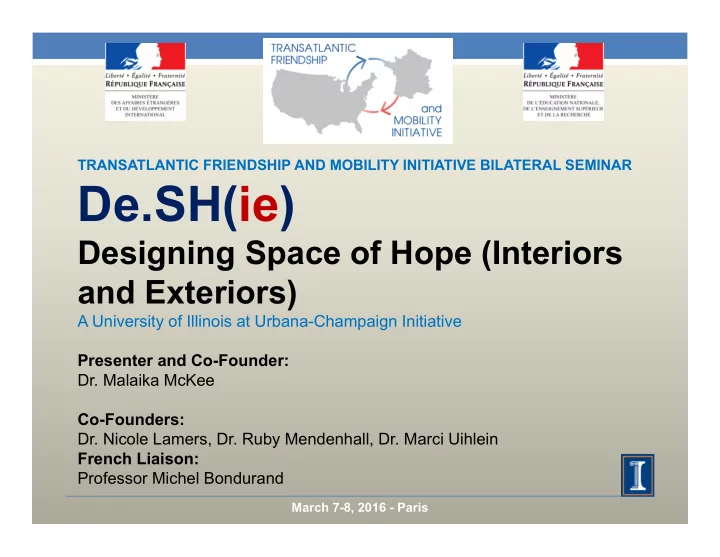 TRANSATLANTIC FRIENDSHIP AND MOBILITY INITIATIVE BILATERAL SEMINAR De.SH(ie) Designing Space of Hope (Interiors and Exteriors) A University of Illinois at Urbana-Champaign Initiative Presenter and Co-Founder: Dr. Malaika McKee Co-Founders: Dr. Nicole Lamers, Dr. Ruby Mendenhall, Dr. Marci Uihlein French Liaison: Professor Michel Bondurand March 7-8, 2016 - Paris