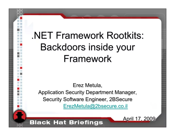 Agenda • Introduction to .NET execution model • Framework modification and malware deployment • .NET-Sploit 1.0 – DLL modification tool • Attack scenarios