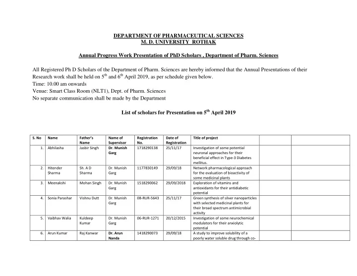 DEPARTMENT OF PHARMACEUTICAL SCIENCES M. D. UNIVERSITY ROTHAK Annual Progress Work Presentation of PhD Scholars , Department of Pharm. Sciences All Registered Ph D Scholars of the Department of Pharm. Sciences are hereby informed that the Annual Presentations of their Research work shall be held on 5 th and 6 th April 2019, as per schedule given below. Time: 10.00 am onwards Venue: Smart Class Room (NLT1), Dept. of Pharm. Sciences No separate communication shall be made by the Department List of scholars for Presentation on 5 th April 2019 S. No Name Father’s Name of Registration Date of Title of project Name Supervisor No. Registration 1. Abhilasha Jasbir Singh Dr. Munish 1718290138 25/11/17 Investigation of some potential Garg neuronal approaches for their beneficial effect in Type-3 Diabetes mellitus. 2. Hitender Sh. A D Dr. Munish 1177830149 29/09/18 Network pharmacological approach Sharma Sharma Garg for the evaluation of bioactivity of some medicinal plants 3. Meenakshi Mohan Singh Dr. Munish 1518290062 29/09/2018 Exploration of vitamins and Garg antioxidants for their antidiabetic potential 4. Sonia Parashar Vishnu Dutt Dr. Munish 08-RUR-5643 25/11/17 Green synthesis of silver nanoparticles Garg with selected medicinal plants for their broad spectrum antimicrobial activity 5. Vaibhav Walia Kuldeep Dr. Munish 06-RUR-1271 20/12/2015 Investigation of some neurochemical Kumar Garg modulators for their anxiolytic potential 6. Arun Kumar Raj Kanwar Dr. Arun 1418290073 29/09/18 A study to improve solubility of a Nanda poorly water soluble drug through co-