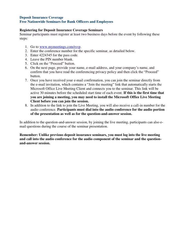 Deposit Insurance Coverage Free Nationwide Seminars for Bank Officers and Employees Registering for Deposit Insurance Coverage Seminars Seminar participants must register at least two business days before the event by following these steps: 1. Go to www.mymeetings.com/rsvp. 2. Enter the conference number for the specific seminar, as detailed below. 3. Enter 4224345 for the pass code. 4. Leave the PIN number blank. 5. Click on the “Proceed” button. 6. On the next page, provide your name, e-mail address, and your company ’s name , and confirm that you have read the conferencing privacy policy and then click the “Proceed” button. 7. Once you have received your e-mail confirmation, you can join the seminar directly from the e-mail invitation, which c ontains a “Join the meeting” link that automatically starts the Microsoft Office Live Meeting Client and connects you to the seminar. This link will be active 30 minutes before the scheduled start time of each event. If this is the first time that you are joining a meeting, you may need to install the Microsoft Office Live Meeting Client before you can join the session. 8. In addition to the link to join the Live Meeting, you will also receive a call-in number for the audio conference. Participants must dial into the audio conference for the audio portion of the presentation as well as for the question-and-answer session. In addition to the question-and-answer session, by joining the live meeting, participants can also e- mail questions during the course of the seminar presentation. Remember: Unlike previous deposit insurance seminars, you must log into the live meeting and call into the audio conference for the audio component of the seminar and the question- and-answer session.