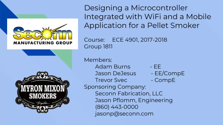 Designing a Microcontroller Integrated with WiFi and a Mobile Application for a Pellet Smoker Course: ECE 4901, 2017-2018 Group 1811 Members: Adam Burns - EE Jason DeJesus - EE/CompE Trevor Svec - CompE Sponsoring Company: Seconn Fabrication, LLC Jason Pflomm, Engineering (860) 443-0000 jasonp@seconn.com