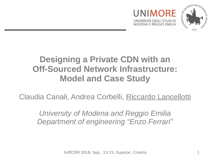 Designing a Private CDN with an Off-Sourced Network Infrastructure: Model and Case Study Claudia Canali, Andrea Corbelli, Riccardo Lancellotti University of Modena and Reggio Emilia Department of engineering “Enzo Ferrari” SoftCOM 2018, Sep., 13-15, Supetar, Croatia 1