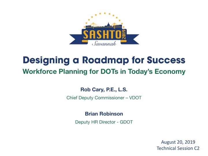 Designing a Roadmap for Success Workforce Planning for DOTs in Today’s Economy Rob Cary, P.E., L.S. Chief Deputy Commissioner – VDOT Brian Robinson Deputy HR Director - GDOT August 20, 2019 Technical Session C2