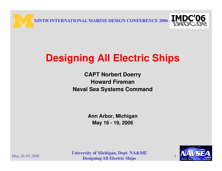 NINTH INTERNATIONAL MARINE DESIGN CONFERENCE 2006 Designing All Electric Ships CAPT Norbert Doerry CAPT Norbert Doerry Howard Fireman Naval Sea Systems Command Ann Arbor, Michigan Ann Arbor, Michigan May 16 - 19, 2006 University of Michigan, Dept. NA&ME May 16-19, 2006 1 Designing All Electric Ships