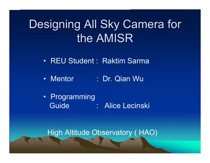 Designing All Sky Camera for Designing All Sky Camera for the AMISR the AMISR • REU Student : Raktim Sarma • Mentor : Dr. Qian Wu • Programming Guide : Alice Lecinski High Altitude Observatory ( HAO)