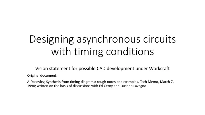 Designing asynchronous circuits with timing conditions Vision statement for possible CAD development under Workcraft Original document: A. Yakovlev, Synthesis from timing diagrams: rough notes and examples, Tech Memo, March 7, 1998; written on the basis of discussions with Ed Cerny and Luciano Lavagno