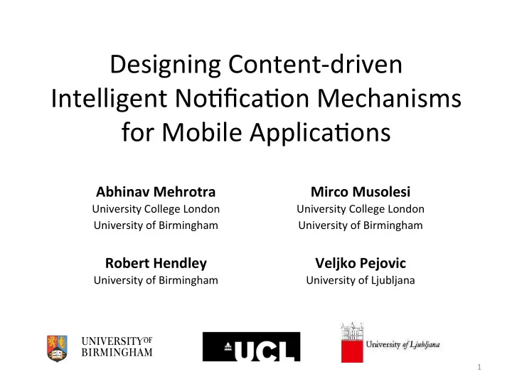 Designing ¡Content-‑driven ¡ ¡ Intelligent ¡No2fica2on ¡Mechanisms ¡ for ¡Mobile ¡Applica2ons ¡ Abhinav ¡Mehrotra ¡ Mirco ¡Musolesi ¡ University ¡College ¡London ¡ University ¡College ¡London ¡ University ¡of ¡Birmingham ¡ University ¡of ¡Birmingham ¡ Robert ¡Hendley ¡ Veljko ¡Pejovic ¡ University ¡of ¡Birmingham ¡ University ¡of ¡Ljubljana ¡ 1 ¡