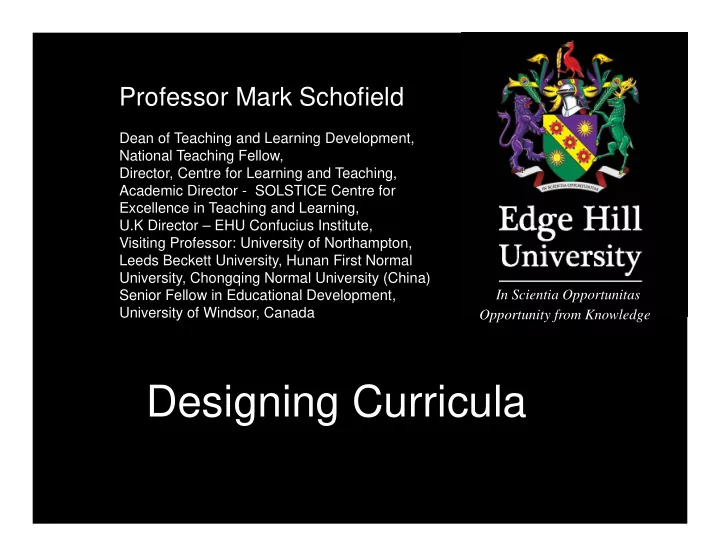 Professor Mark Schofield Dean of Teaching and Learning Development, National Teaching Fellow, Director, Centre for Learning and Teaching, Academic Director - SOLSTICE Centre for Excellence in Teaching and Learning, U.K Director – EHU Confucius Institute, Visiting Professor: University of Northampton, Leeds Beckett University, Hunan First Normal University, Chongqing Normal University (China) Senior Fellow in Educational Development, In Scientia Opportunitas University of Windsor, Canada Opportunity from Knowledge Designing Curricula