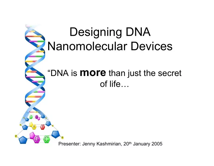 Designing DNA Nanomolecular Devices “DNA is more than just the secret of life… Presenter: Jenny Kashmirian, 20 th January 2005