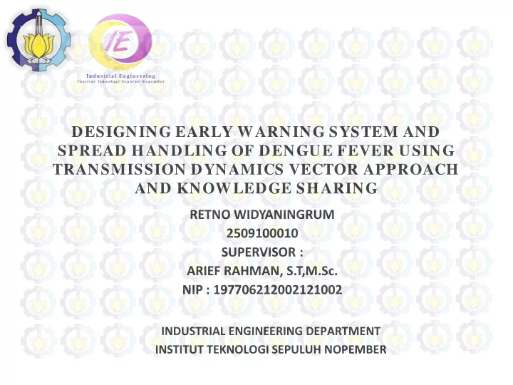 DESIGNING EARLY WARNING SYSTEM AND SPREAD HANDLING OF DENGUE FEVER USING TRANSMISSION DYNAMICS VECTOR APPROACH AND KNOWLEDGE SHARING RETNO WIDYANINGRUM 2509100010 SUPERVISOR : ARIEF RAHMAN, S.T,M.Sc. NIP : 197706212002121002 INDUSTRIAL ENGINEERING DEPARTMENT INSTITUT TEKNOLOGI SEPULUH NOPEMBER