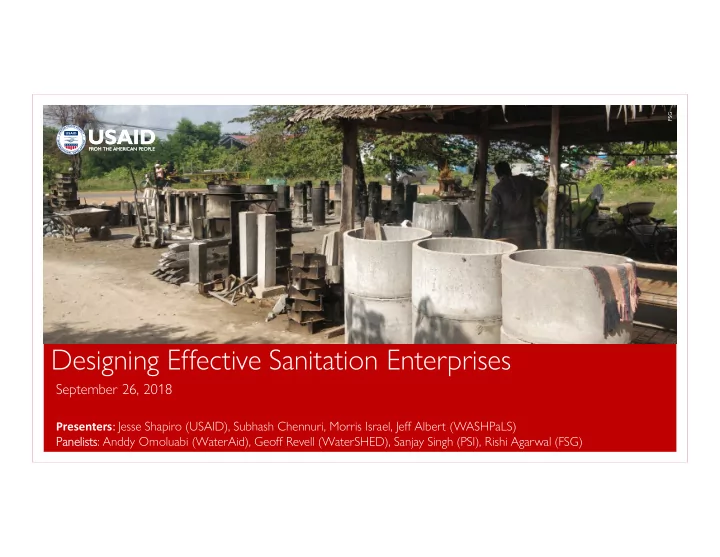 FSG Designing Effective Sanitation Enterprises September 26, 2018 Presenters : Jesse Shapiro (USAID), Subhash Chennuri, Morris Israel, Jeff Albert (WASHPaLS) Pa Paneli lists: Anddy Omoluabi (WaterAid), Geoff Revell (WaterSHED), Sanjay Singh (PSI), Rishi Agarwal (FSG)