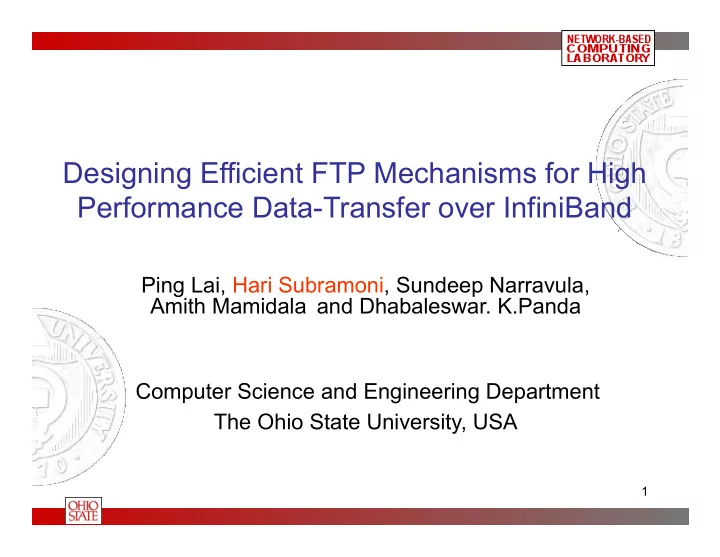 Designing Efficient FTP Mechanisms for High Performance Data-Transfer over InfiniBand Ping Lai, Hari Subramoni, Sundeep Narravula, Amith Mamidala and Dhabaleswar. K.Panda Computer Science and Engineering Department The Ohio State University, USA 1