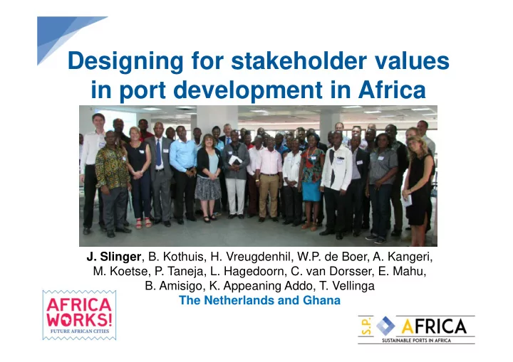 Designing for stakeholder values in port development in Africa J. Slinger , B. Kothuis, H. Vreugdenhil, W.P. de Boer, A. Kangeri, M. Koetse, P. Taneja, L. Hagedoorn, C. van Dorsser, E. Mahu, B. Amisigo, K. Appeaning Addo, T. Vellinga The Netherlands and Ghana