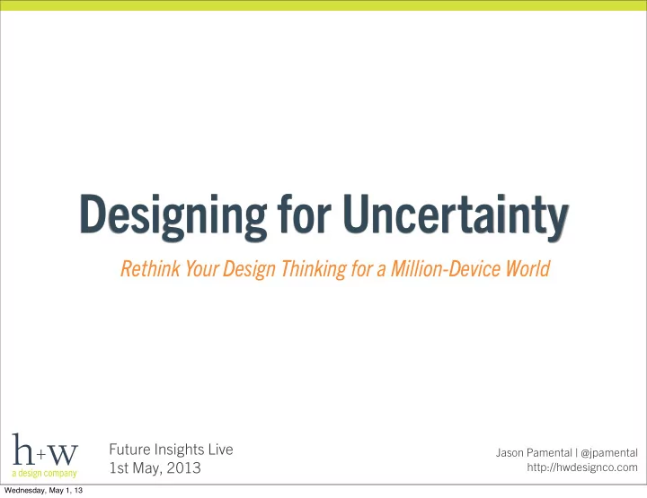 Designing for Uncertainty Rethink Your Design Thinking for a Million-Device World Future Insights Live Jason Pamental | @jpamental 1st May, 2013 http://hwdesignco.com Wednesday, May 1, 13