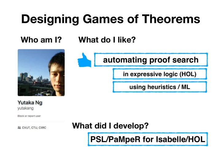 Designing Games of Theorems Who am I? What do I like? automating proof search in expressive logic (HOL) using heuristics / ML What did I develop? PSL/PaMpeR for Isabelle/HOL