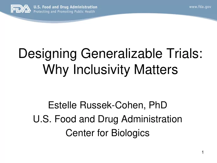 Designing Generalizable Trials: Why Inclusivity Matters Estelle Russek-Cohen, PhD U.S. Food and Drug Administration Center for Biologics 1