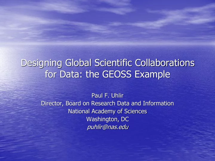 Designing Global Scientific Collaborations for Data: the GEOSS Example Paul F. Uhlir Director, Board on Research Data and Information National Academy of Sciences Washington, DC puhlir@nas.edu
